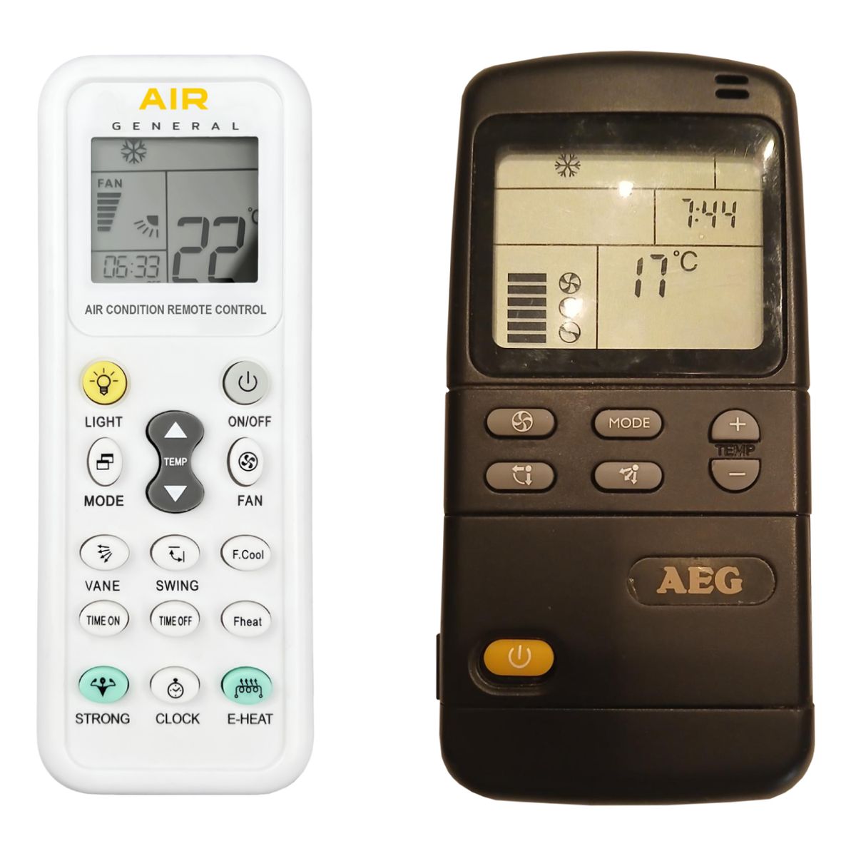 This remote control is available on specialized AIR CONDITION remote control General AIR with display (shown on the left), which was made specifically for air conditioners AEG. We guarantee that the remote control will perform all the functions of the original RC.