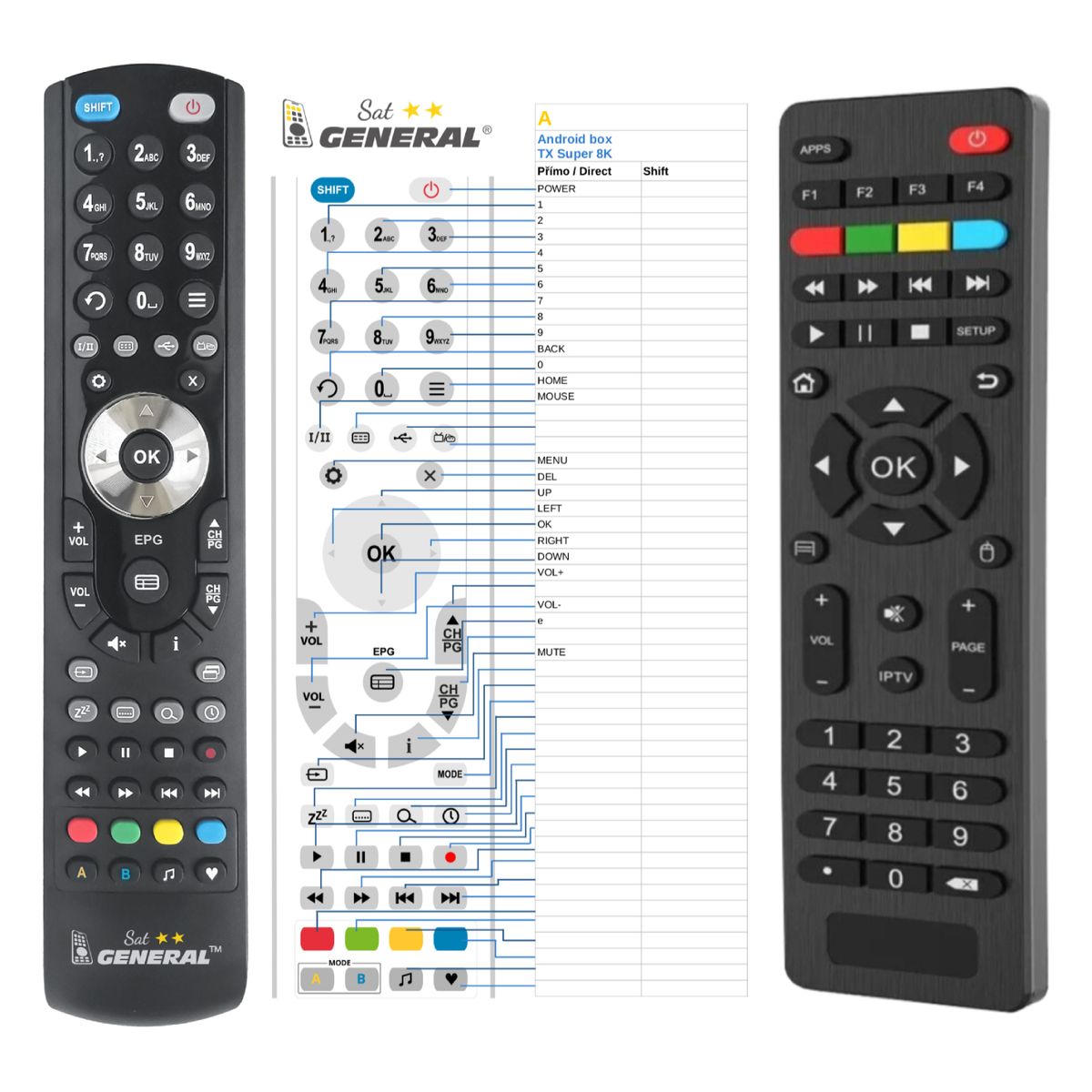 This remote control is available on branded remote control General SAT/TV (shown on the left). We guarantee that the remote control will perform all the functions of the original RC.