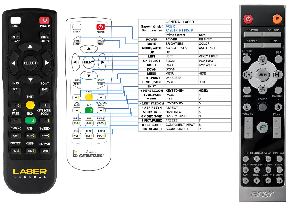 El mando a distancia se suministra en versión del mando a distancia de marca General LASER (se muestra a la izquierda). Garantizamos que el mando realizará todas las funciones del mando a distancia original.