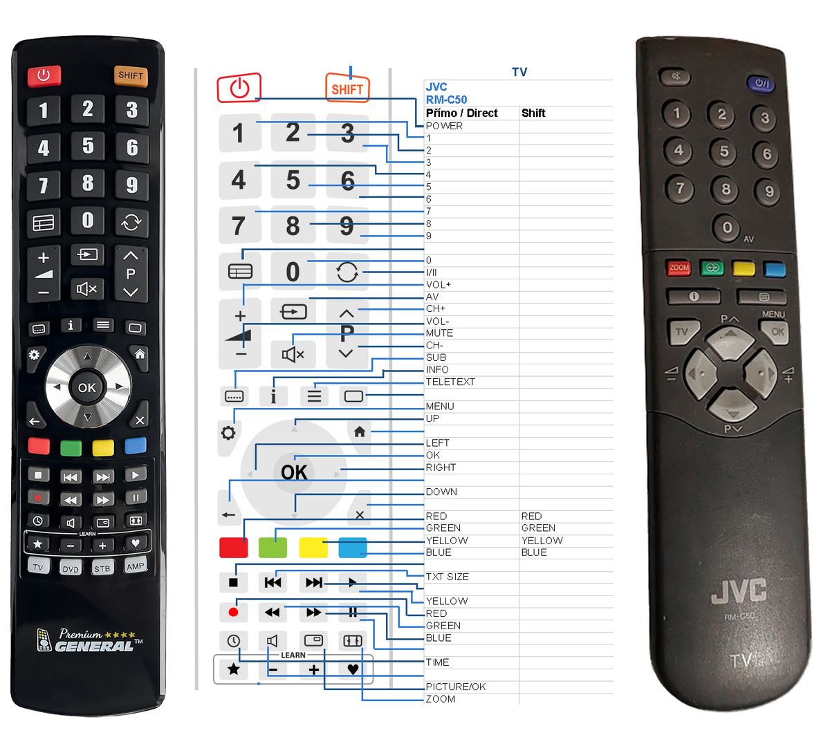 This remote control is available on branded remote control General Premium (shown on the left). We guarantee that the remote control will perform all the functions of the original RC.