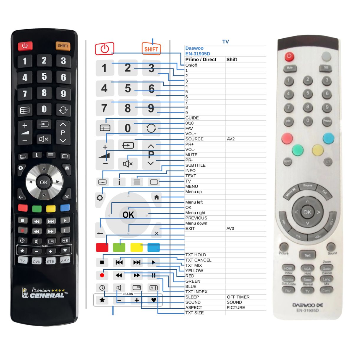Deze afstandsbediening is beschikbaar op merkafstandsbediening General Premium (links afgebeeld). Wij garanderen dat de afstandsbediening alle functies van de originele afstandsbediening vervult.