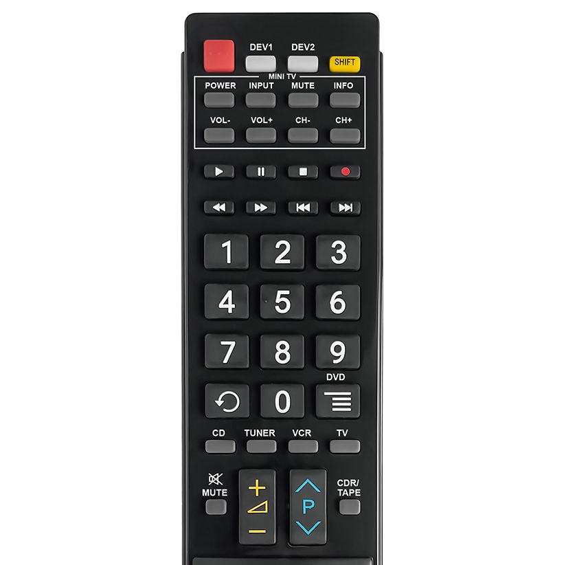Afstandsbediening duplicaat 2 in 1: Deze afstandsbediening biedt een leerknop die u kunt gebruiken om functies van uw originele afstandsbediening te leren/kopiëren (in de MINI-TV sectie). Dit betekent dat u twee apparaten met slechts één afstandsbediening kunt bedienen (b.v. uw DVD en basistelevisiefuncties). De instructies voor het gebruik van de leertoetsen worden samen met de afstandsbediening bijgevoegd.