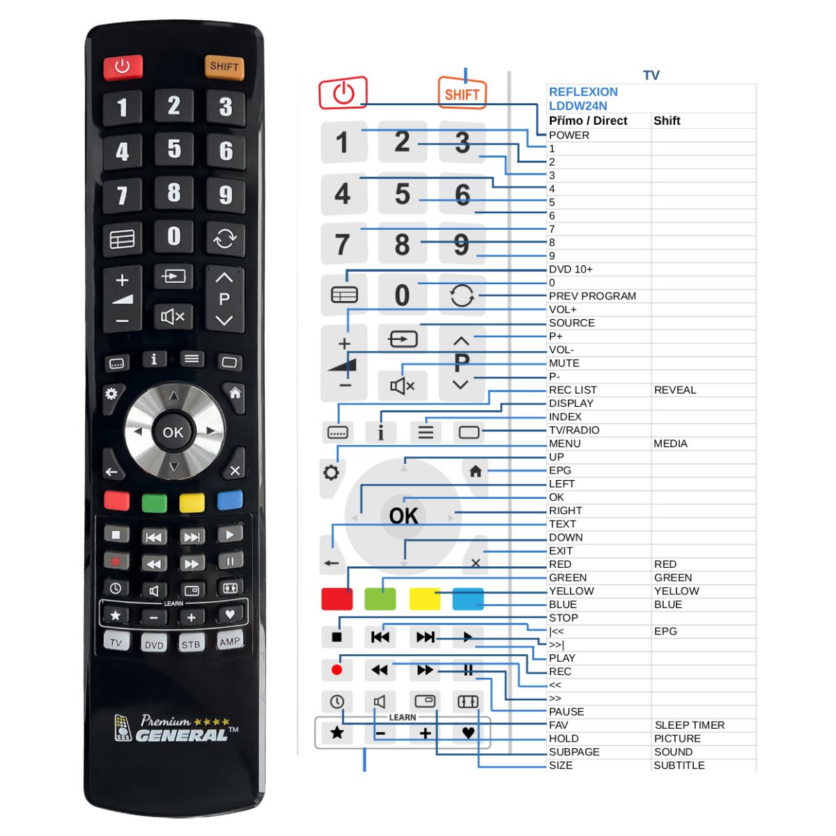Deze afstandsbediening is beschikbaar op merkafstandsbediening General Premium (links afgebeeld). Wij garanderen dat de afstandsbediening alle functies van de originele afstandsbediening vervult.