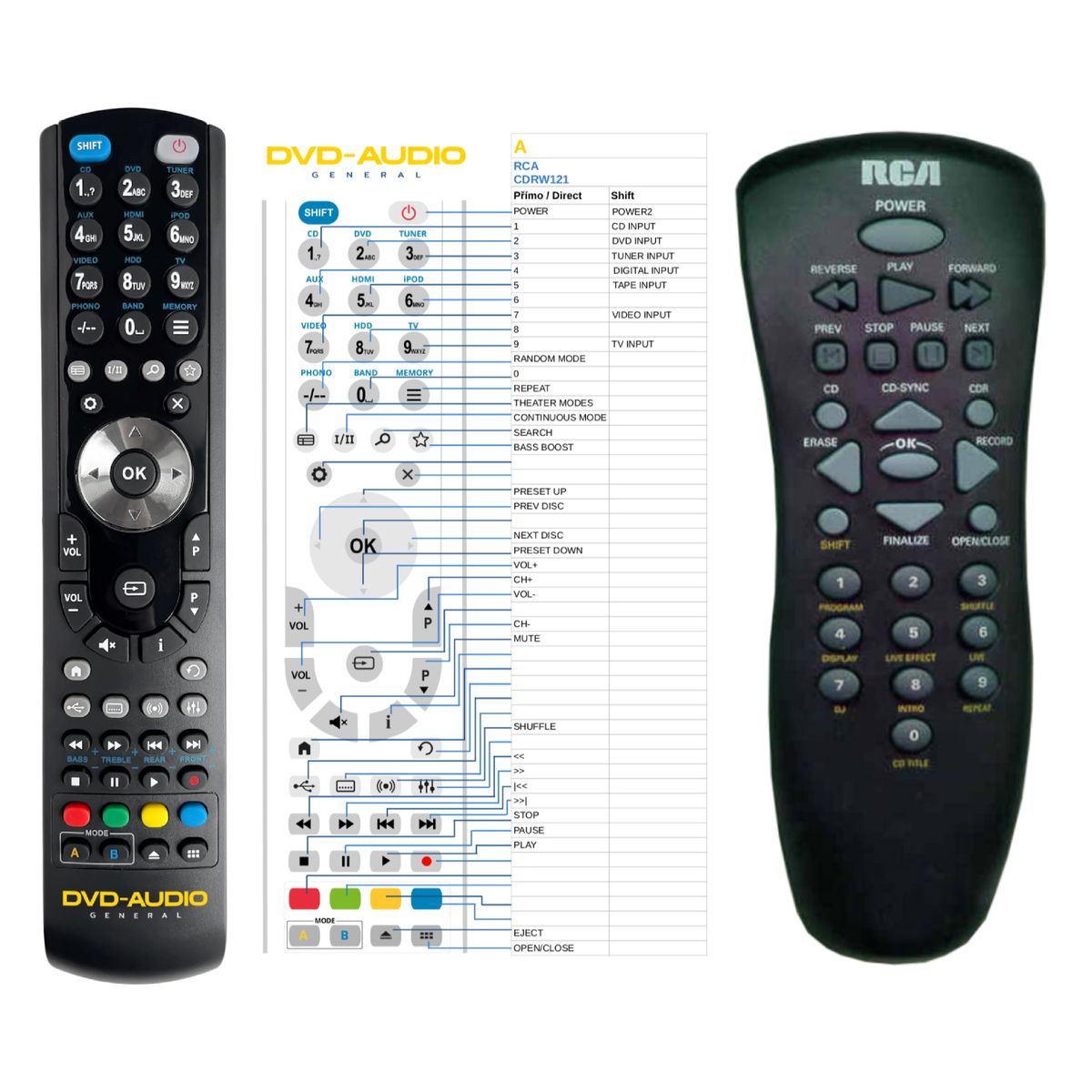 This remote control is available on branded remote control General DVD/AUDIO (shown on the left). We guarantee that the remote control will perform all the functions of the original RC.