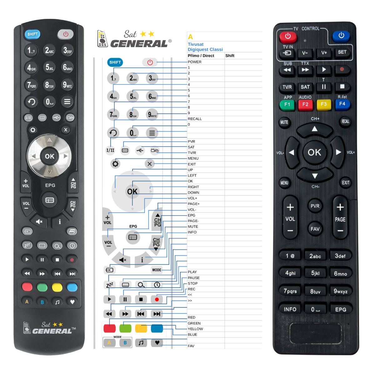This remote control is available on branded remote control General SAT/TV (shown on the left). We guarantee that the remote control will perform all the functions of the original RC.